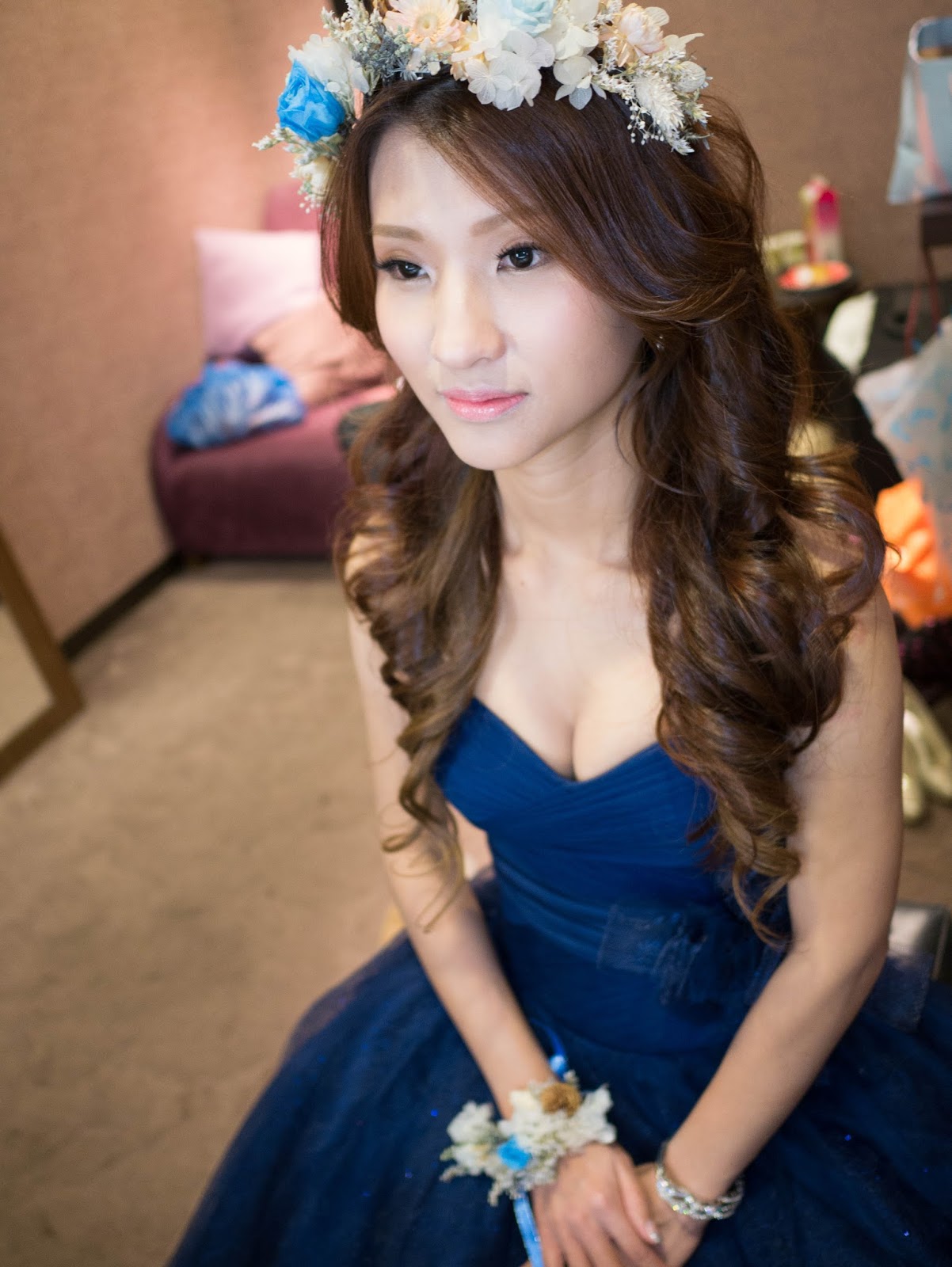 kiki手做的花圈,Anna一開始溝通時深怕花圈跟這套藍色禮服不搭,kiki特別是做了藍色花圈還有冬天氣息雪花風格的花圈,深獲好評噢^___^配上kiki的蓬鬆大捲髮,真的很好看