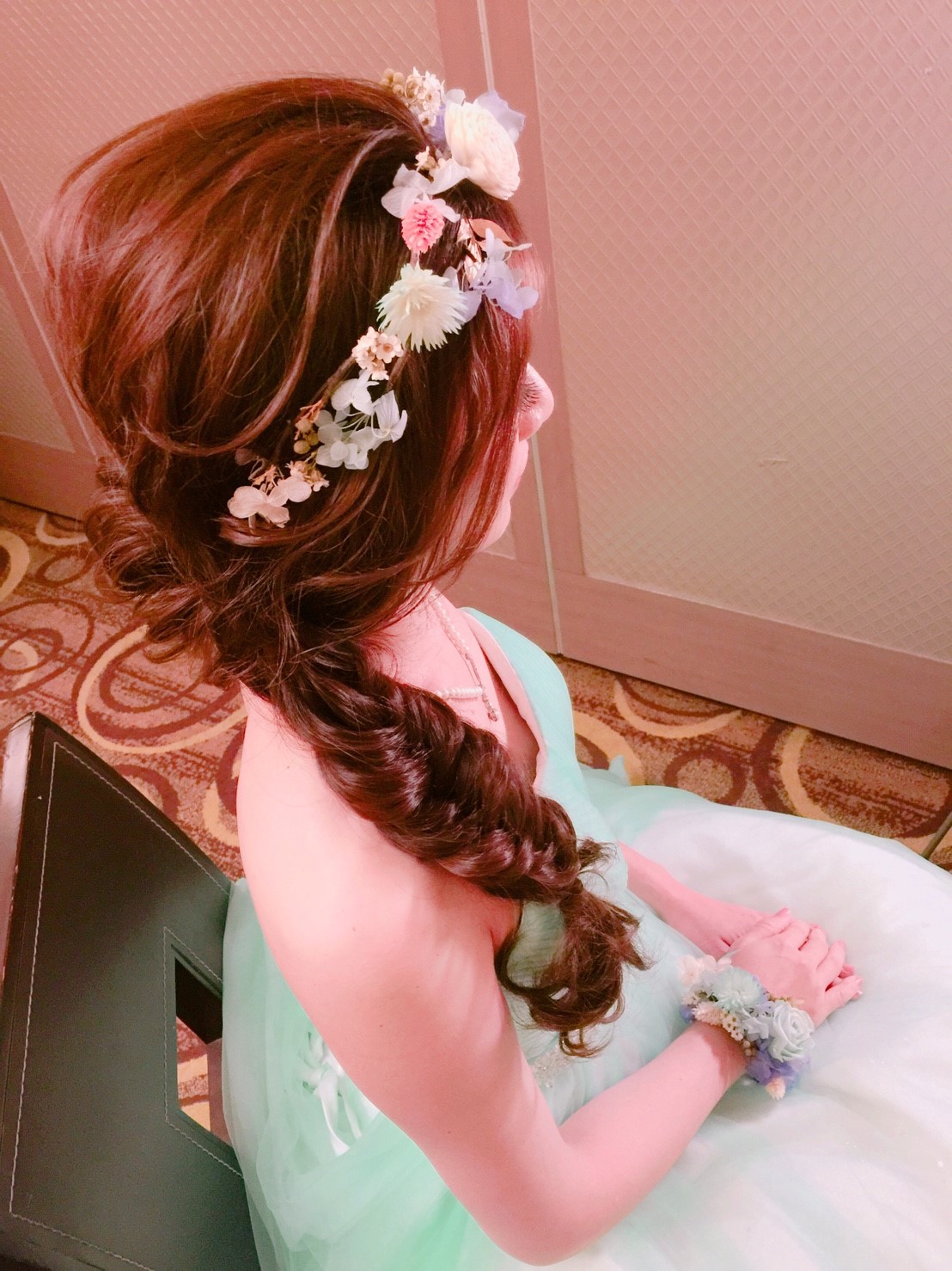 送客造型:很可愛的側邊編髮造型,當然要搭配上kiki為每一位新娘特製的花藝飾品,但這時相機居然給我沒電~~~~~~~~~拍桌拍桌!!