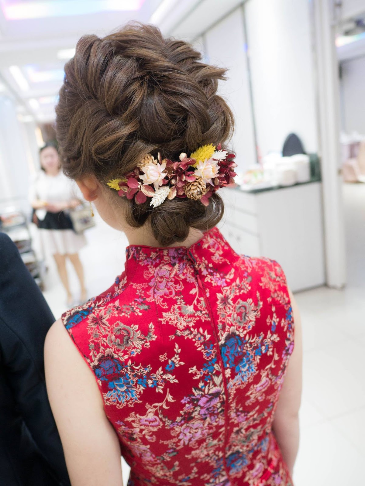 訂婚儀式造型為了搭配伃倩的改良式旗袍,kiki為她設計一個不貼頭,得以修飾臉型的的立體復古瀏海,和線條感的十足的低盤髮造型,讓親友稱讚不停的髮型唷!