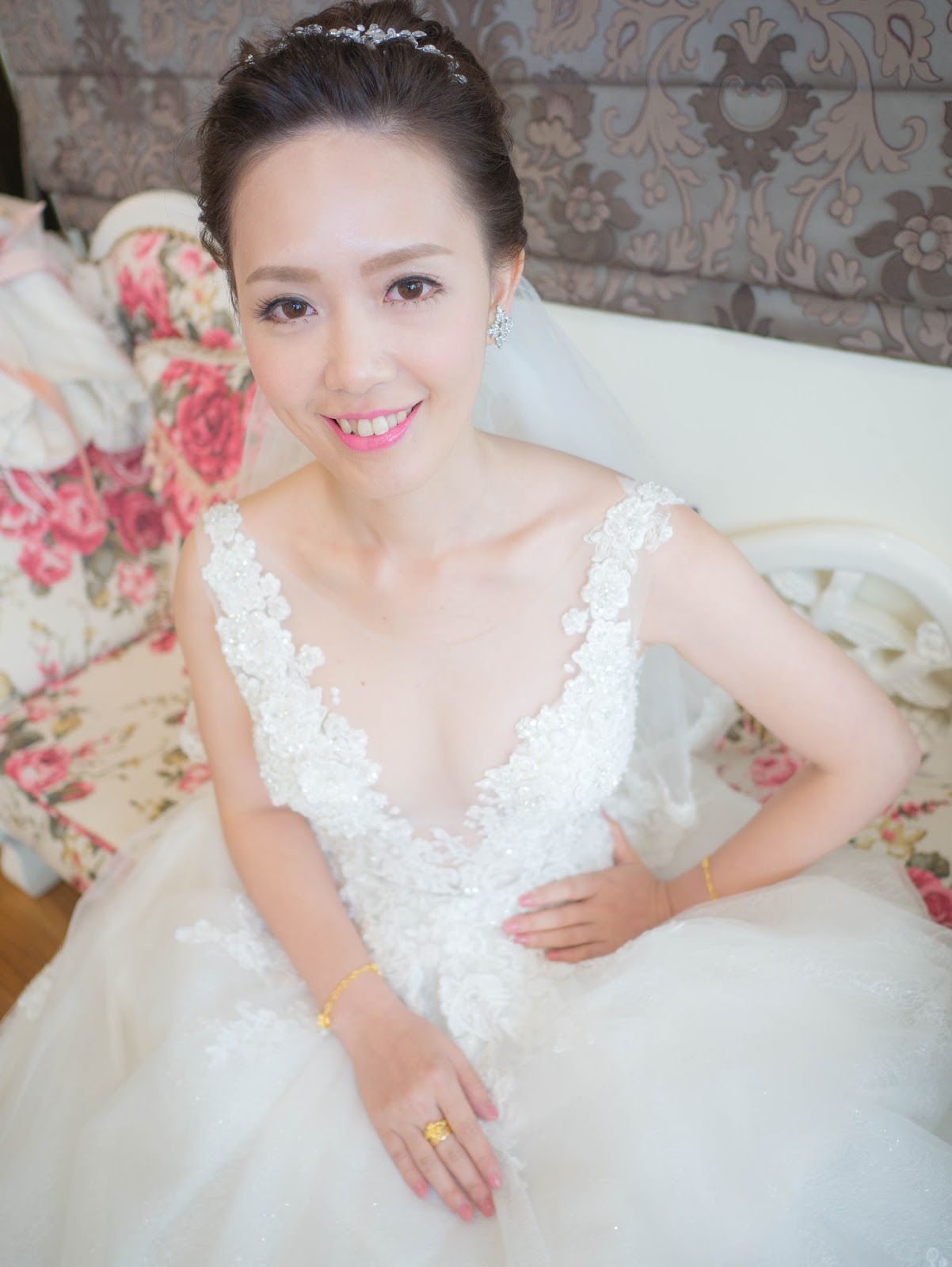 今天新娘的白紗要讓kiki噴鼻血了~紫光穿真是太好看~前v後v的白紗設計,kiki超喜歡的,中間都是鏤空蕾絲,實在太美阿~!!!