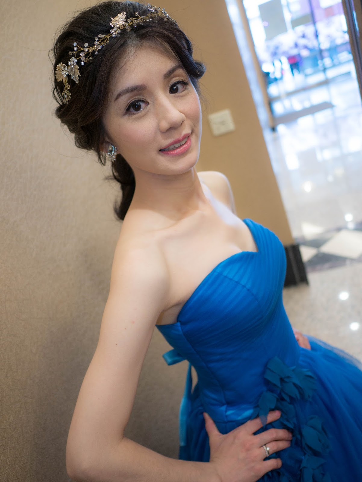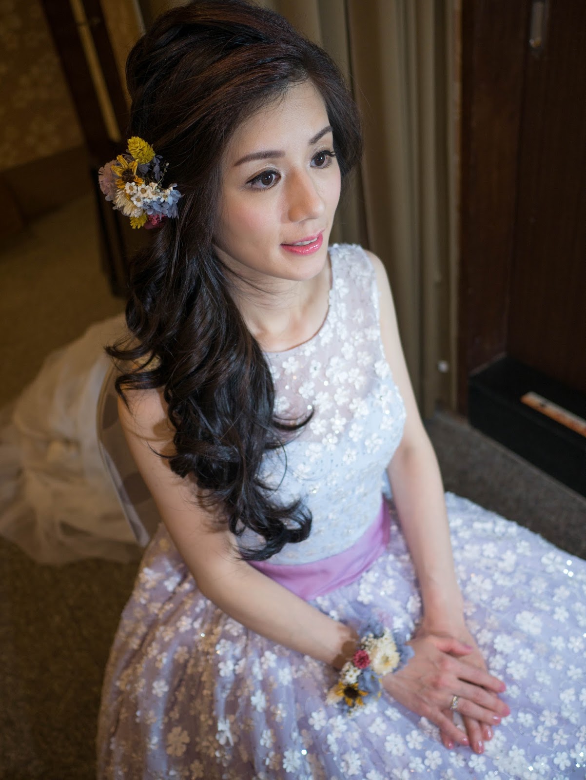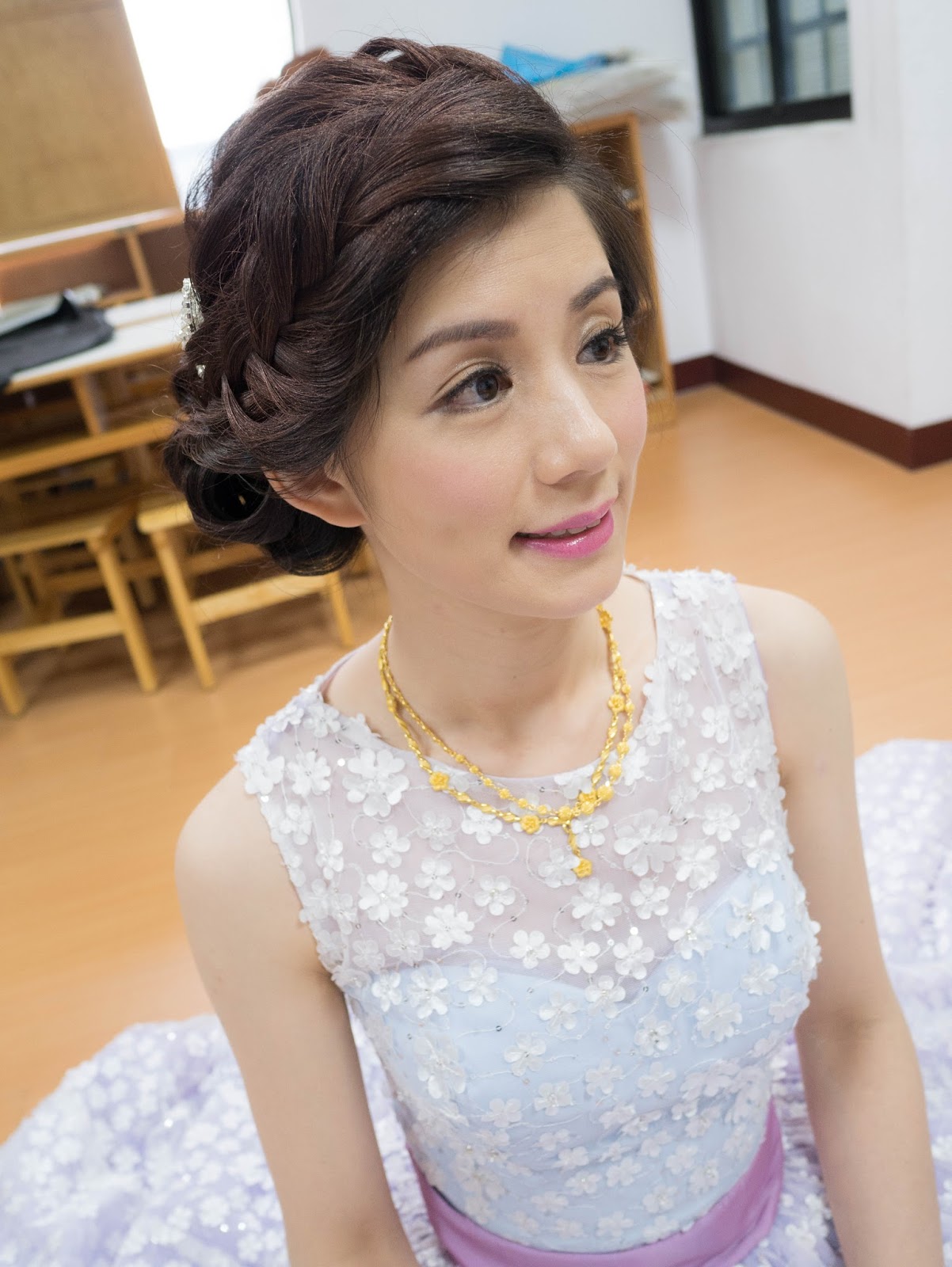 Vivian的訂婚禮服很特別唷,很浪漫、可愛,有別以往新人挑選的粉色或紅色禮服,vivian有特別說過不喜歡老氣的感覺,所以幫他做了個年輕可愛的編髮造型。